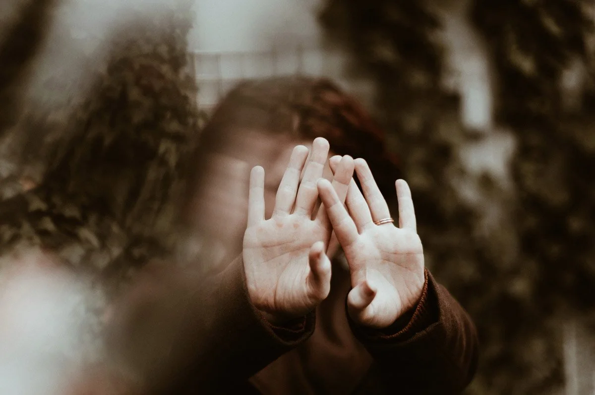 En ung pojke med långt hår som täcker ansiktet med händerna, sitter i en skog med blommor på marken och ett träd bakom honom.
